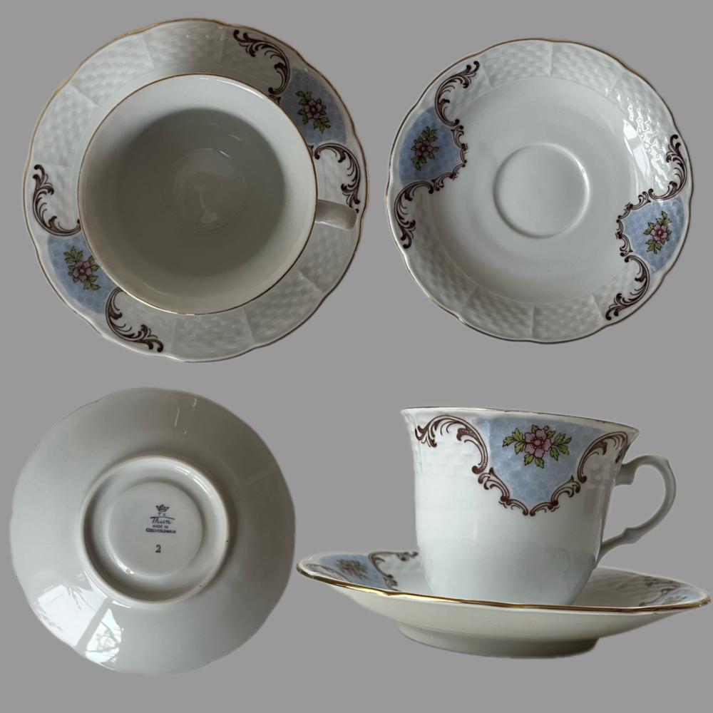 Фарфор Thun — один из старейших в Европе, его изготавливают с конца XVIII века. Эта чашка и блюдце, с маркировкой “Made in Czechoslovakia”, вероятно, были созданы в середине XX века — время, когда ручная роспись и изысканная форма оставались символом стиля и утончённости.