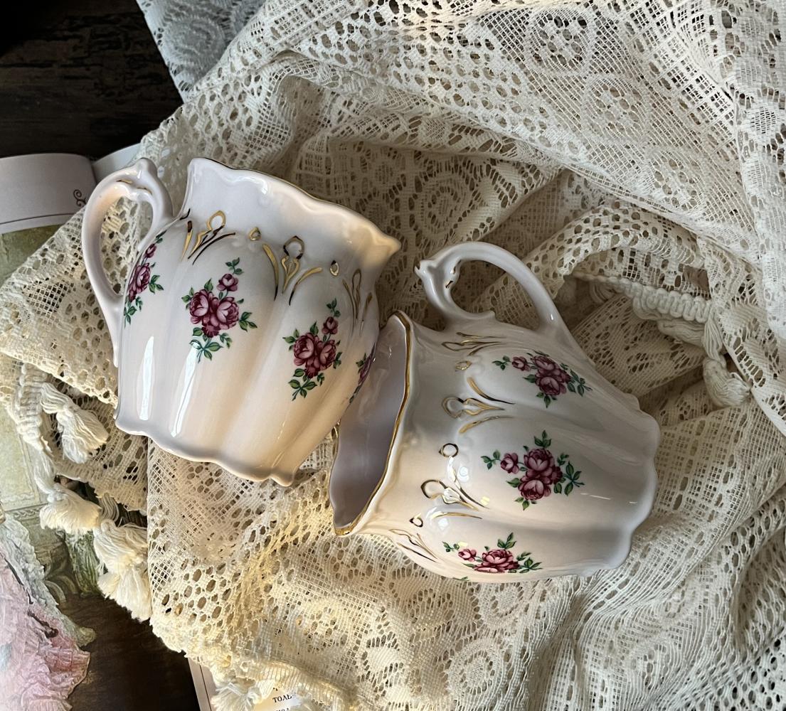 Изящная кружка классической формы с мягким рельефом корпуса и волнистым краем. Декор — нежные розовые розы, дополненные тонким растительным орнаментом и аккуратным золочением по краю. Очень гармоничное сочетание — ничего лишнего, только спокойная, аристократичная красота.