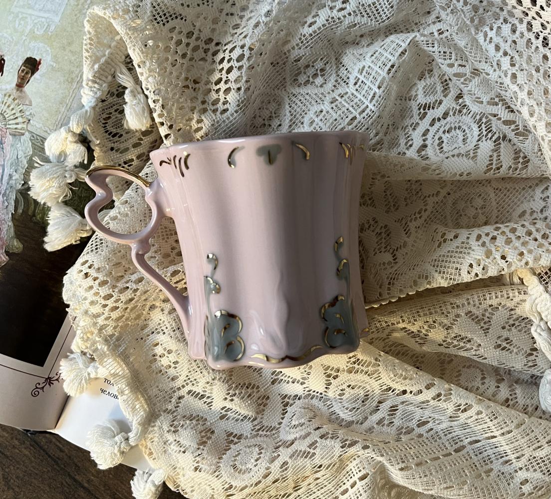 Нежно-розовая кружка с рельефной формой и выразительной фигурной ручкой. Мягкие грани, пастельный декор и аккуратная позолота — всё очень деликатно, без лишнего блеска.